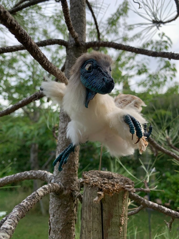 This model is made from a hand sculpted polymer clay face-up and claws over a custom armature with real hand-worked feather wings and brushed alpaca wool fuzzy coat, she is set with glass eyes that “follow” the viewer.
